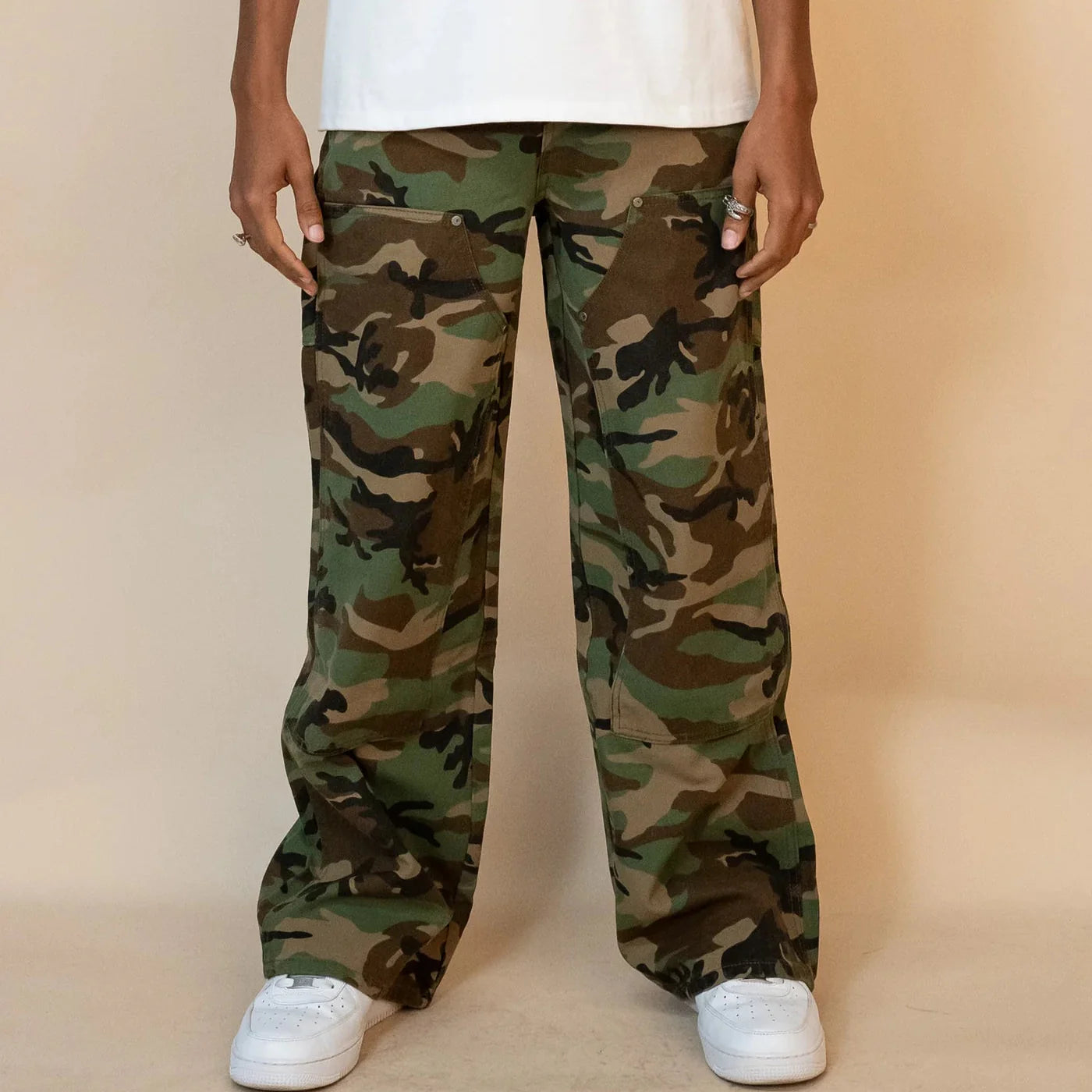100% Cotton Relaxed Fit Garment Wash Double Knee Panels Carpenter Pocketing Cargo Pockets Metal Logo Hardware