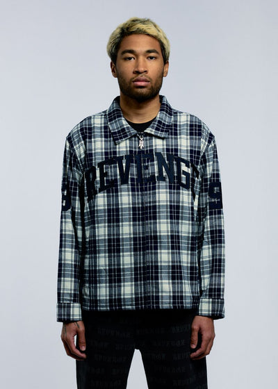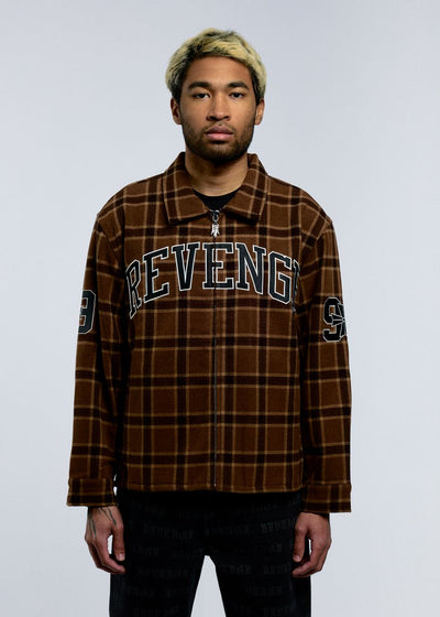 Button up shirt with pointed collar in brushed plaid flannel Custom shiny nickel zipper and snap buttons Front chest, sleeve, and back embroidery Standard fit
