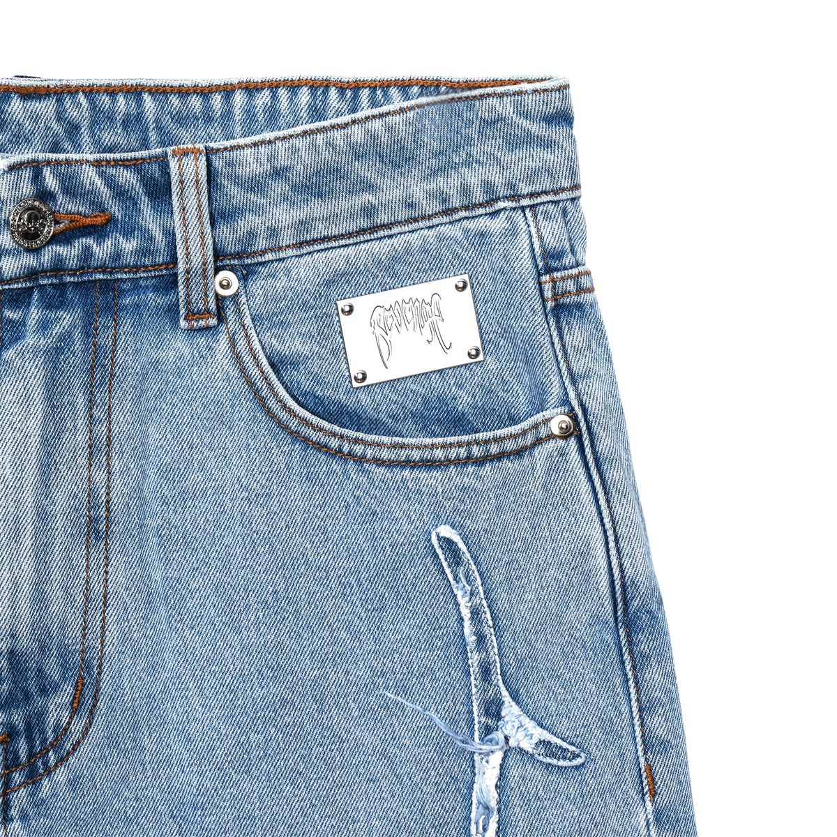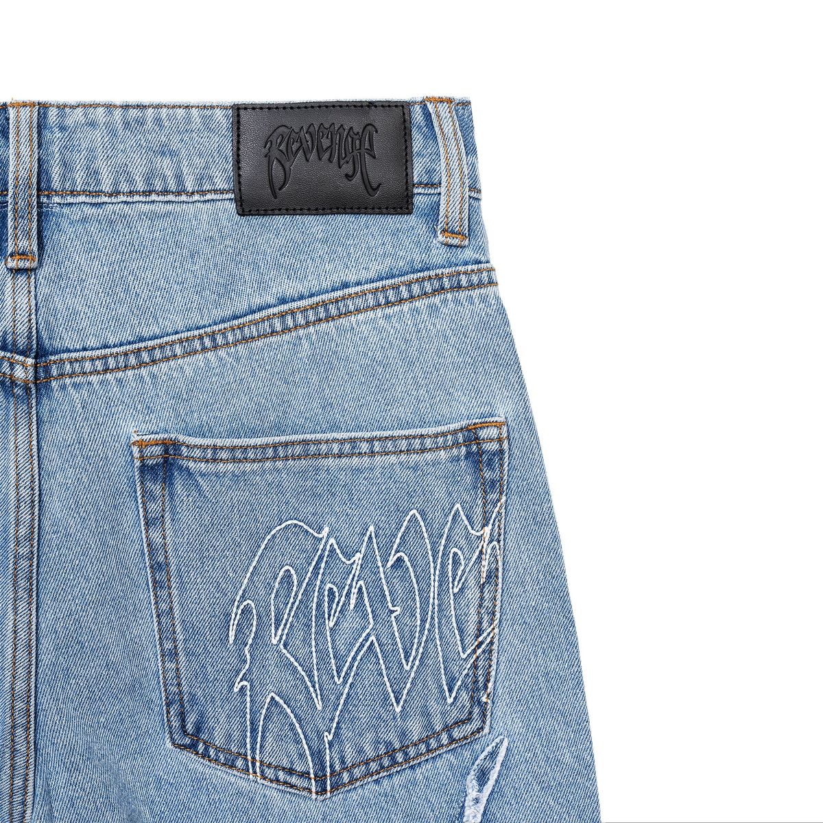13 oz waxed denim with 5 pocket styling Laser cut embroidered spider web motifs on front and back legs Custom metal tack button Custom logo debossed metal plate Debossed logo grained leather patch Straight fit with a slightly flared leg