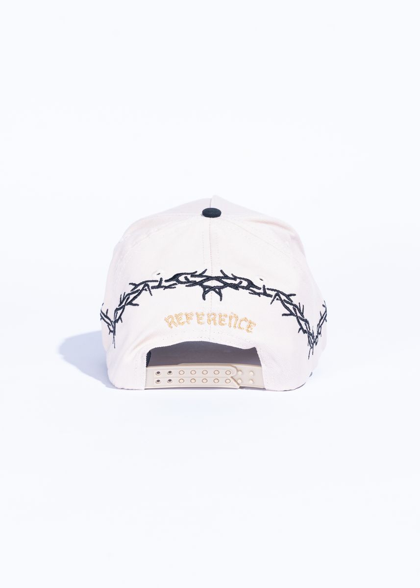 - Fully adjustable structured snapback - 3D front embroidery - Barbed wire all panel embroidery - Gold Thread "REFERENCE" embroidery arched over rear of hat - Seamless front panel with full buckram - 6 row stitching on visor - Custom branded interior taping - Custom double row "R" snap - Comfortable cotton canvas material